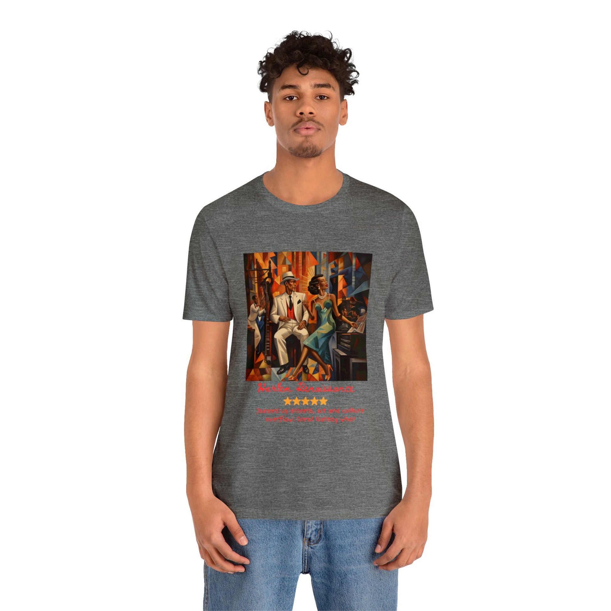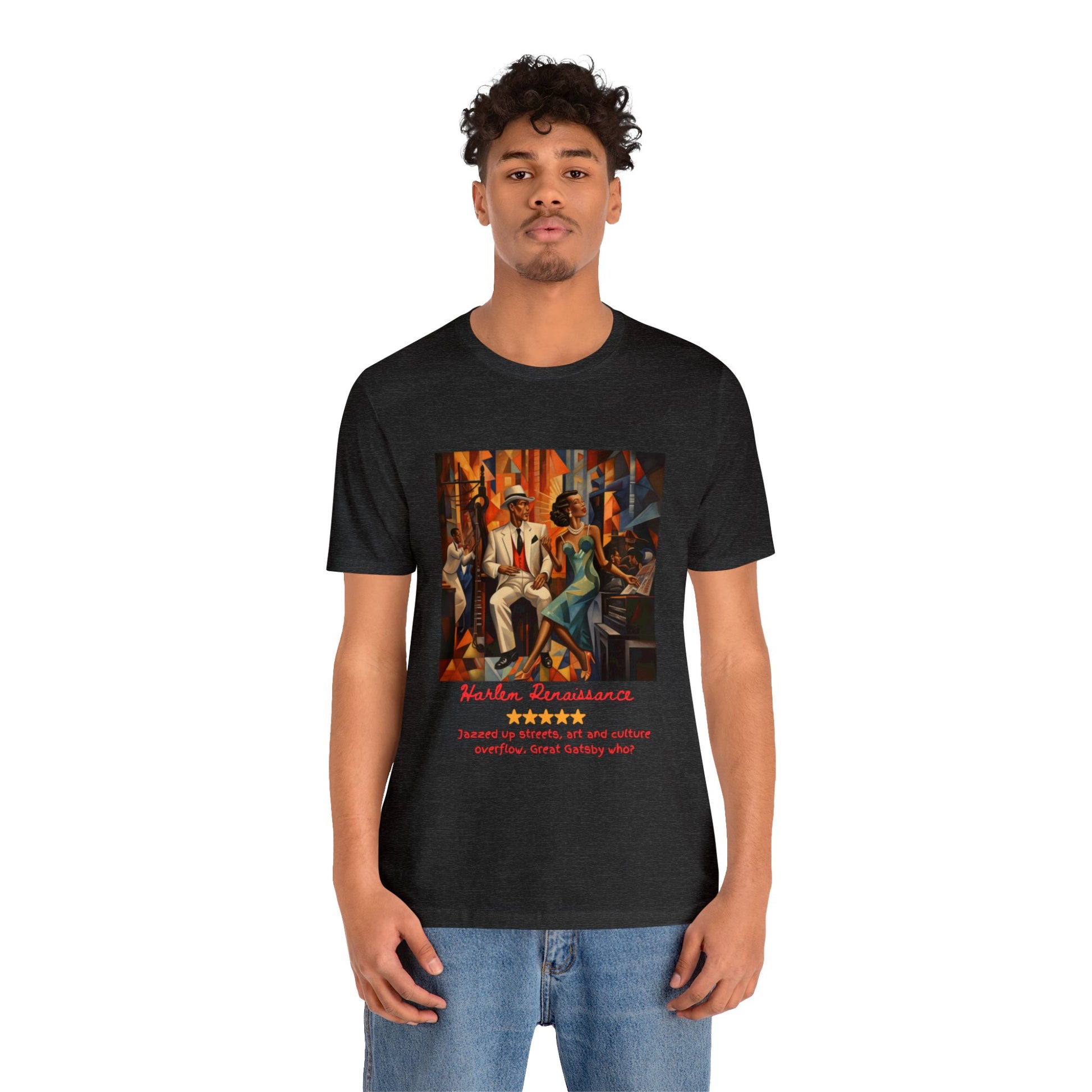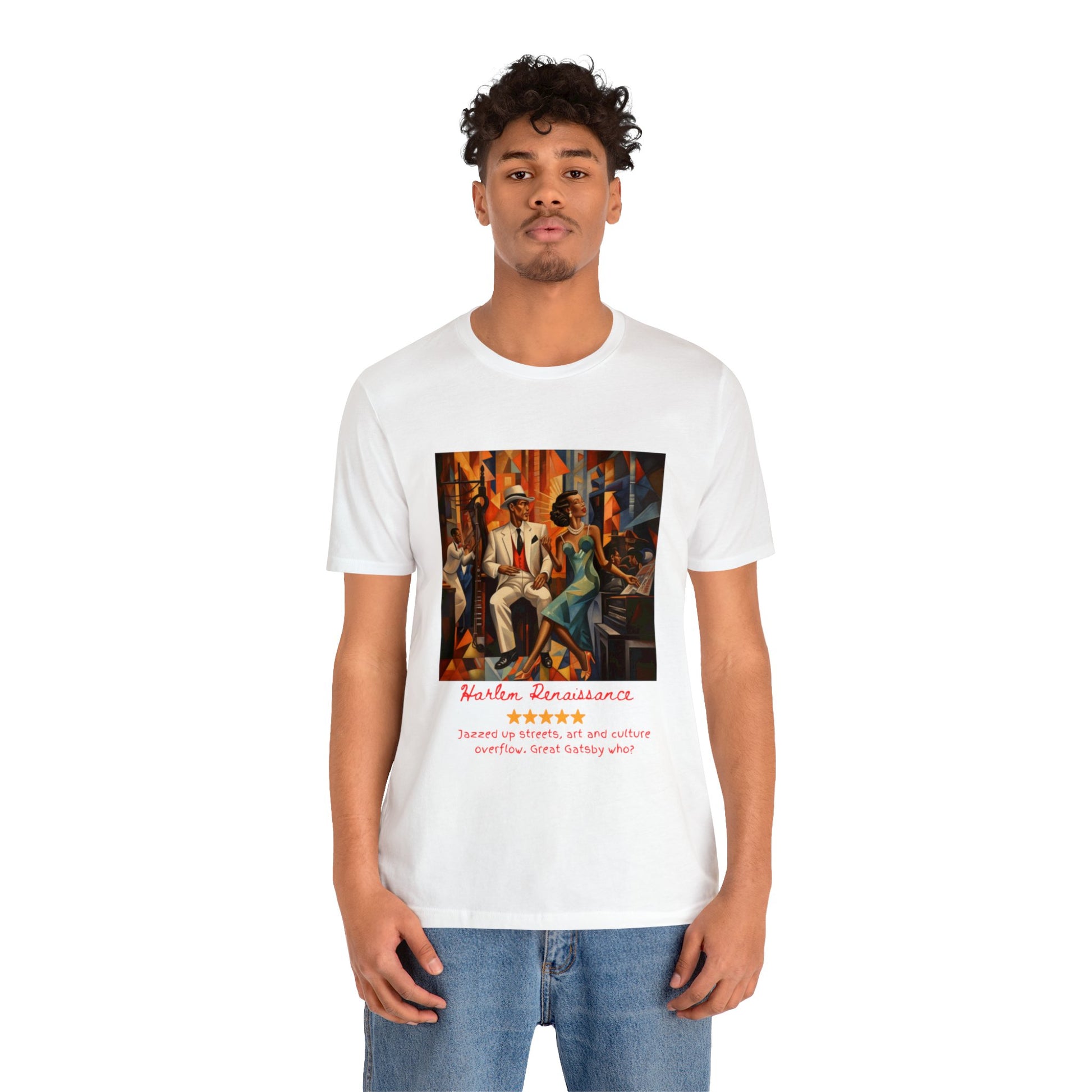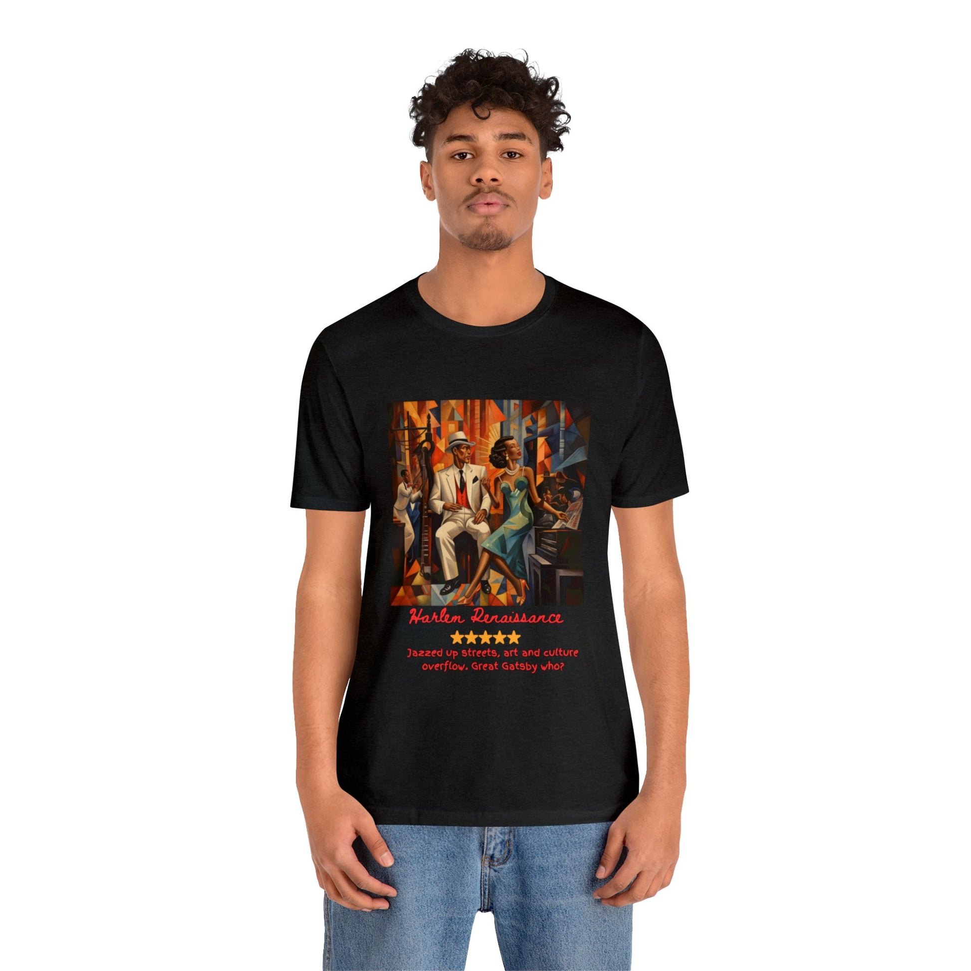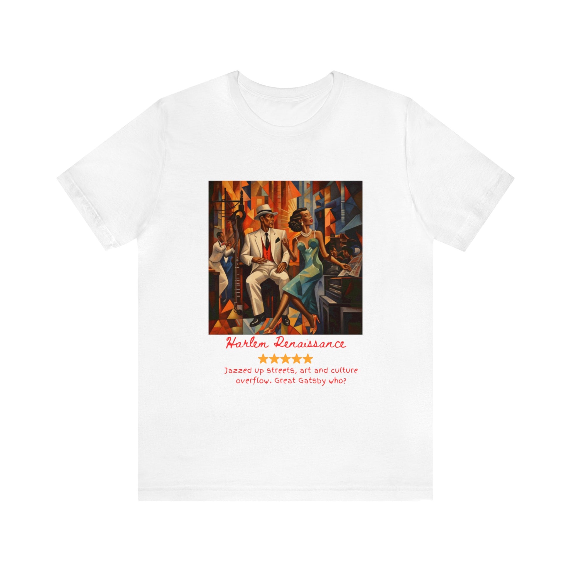 Harlem Renaissance- Yelp review inspired teethe soft cotton is incredibly comfortable, and the print quality is top-notch, ensuring it remains a favorite in my wardrobe. The ribbed knit collars and taping on the shoulders are thoughtful touches that guarantee a great fit over time. I'm impressed by the attention to detail, and the dual side seams are definitely a game-changer in maintaining the tee's shape