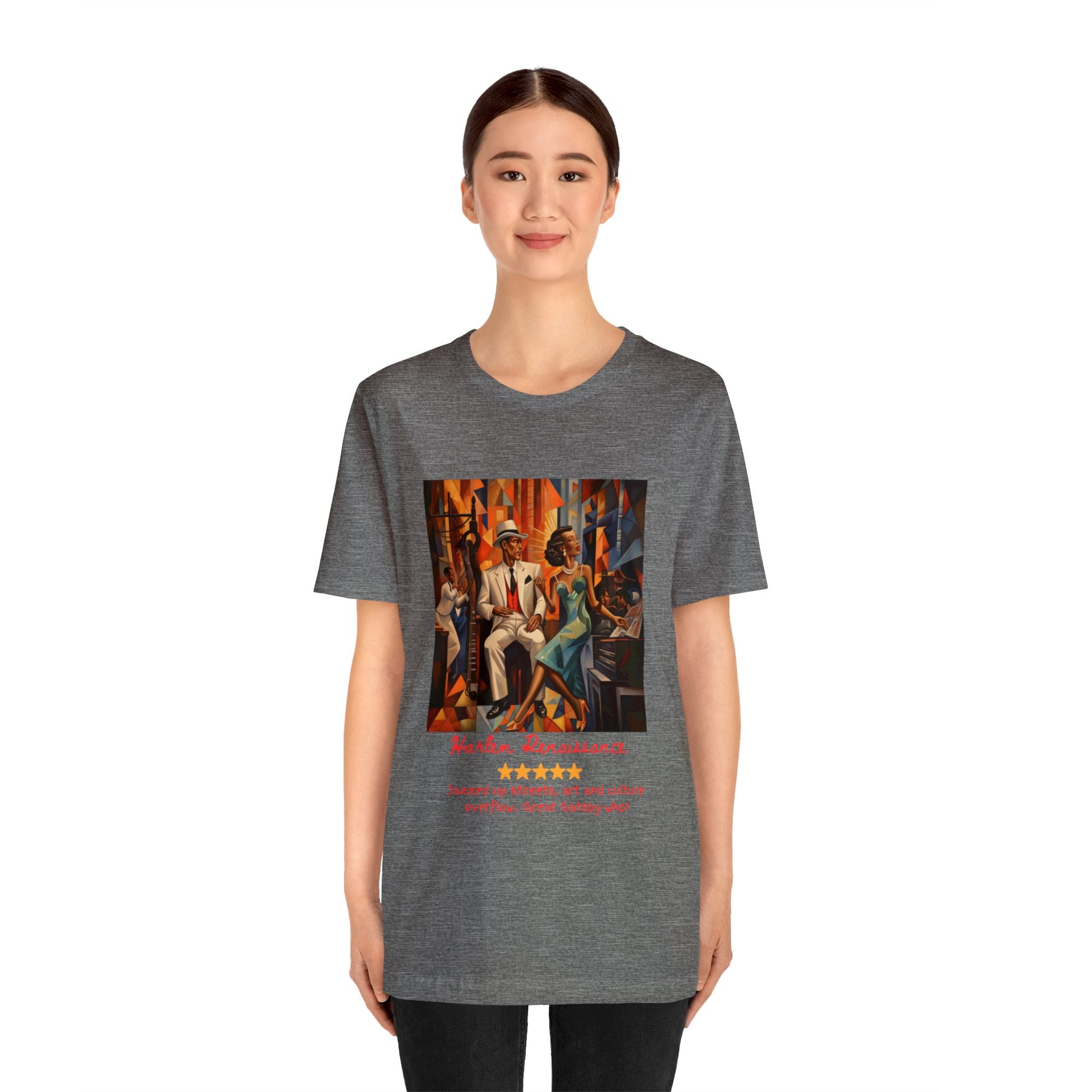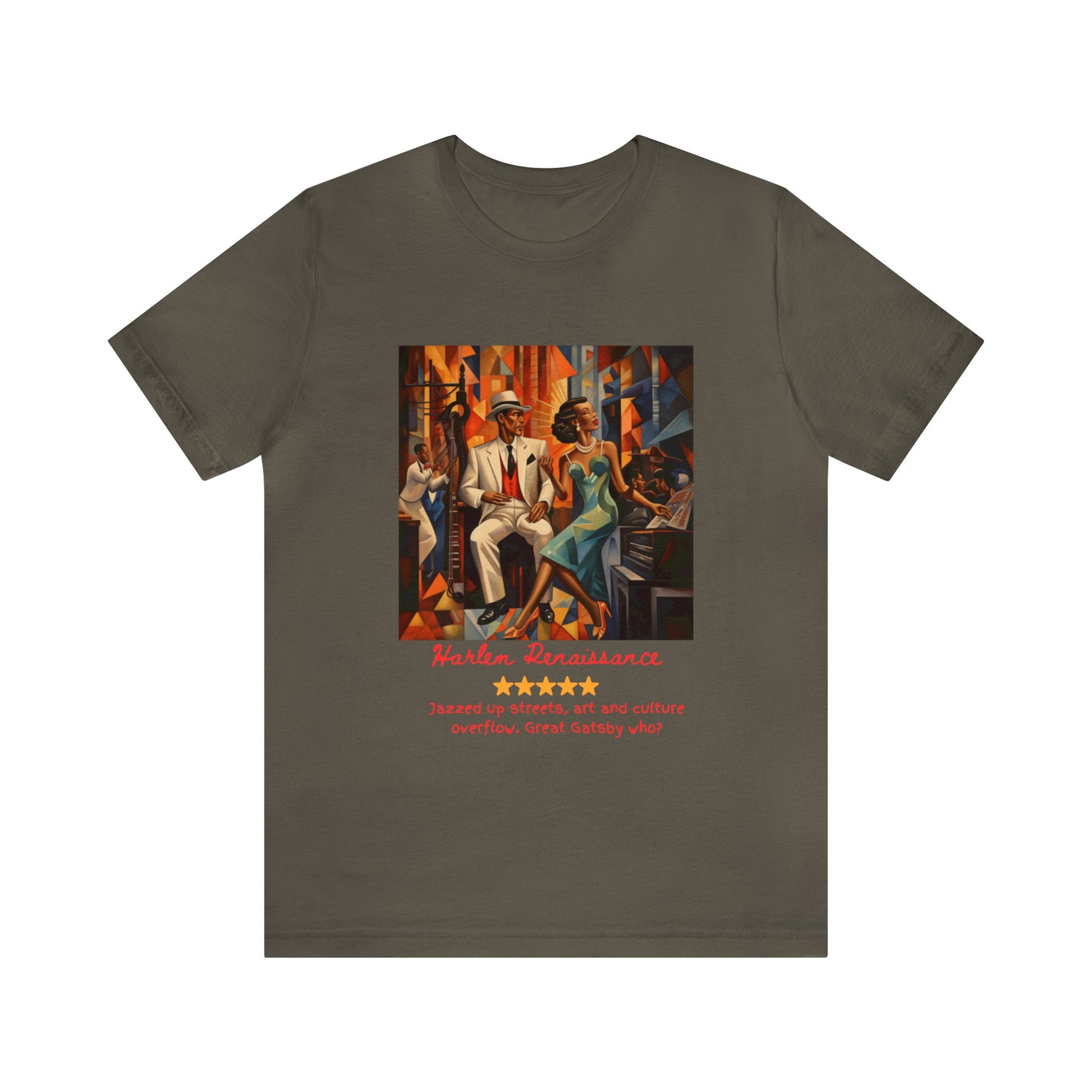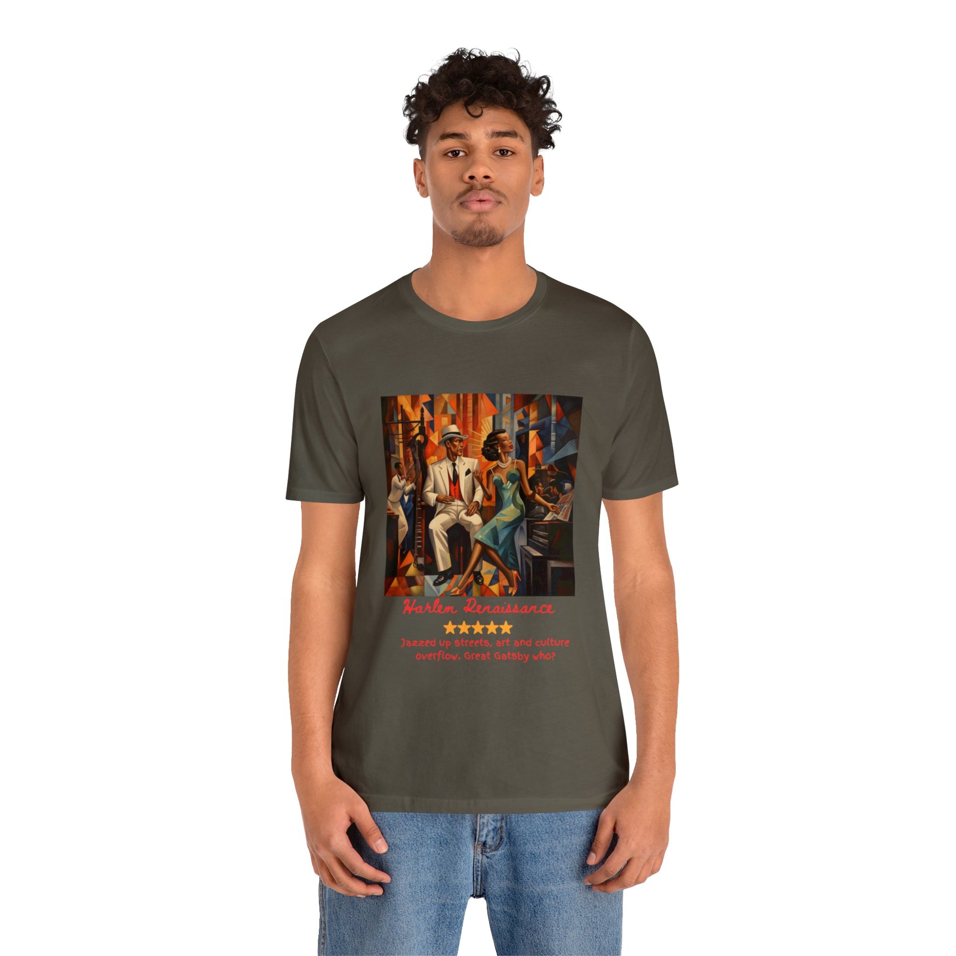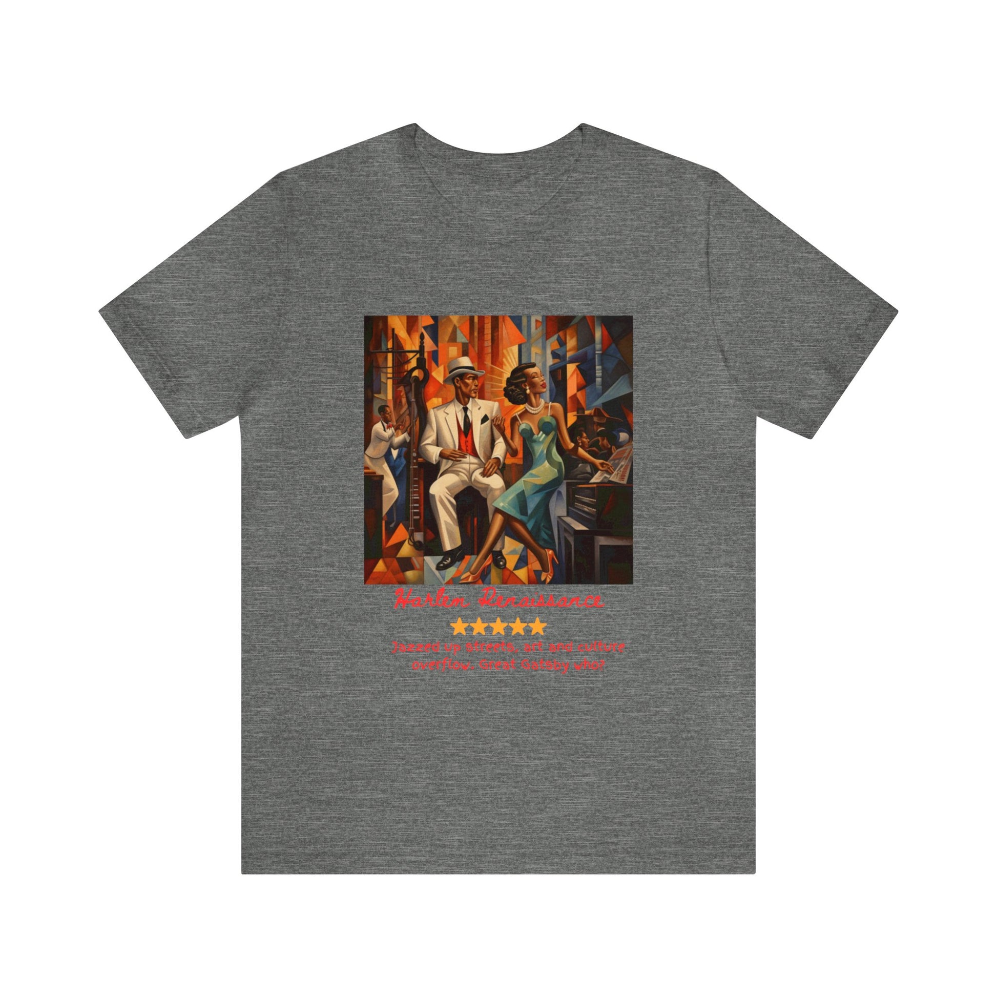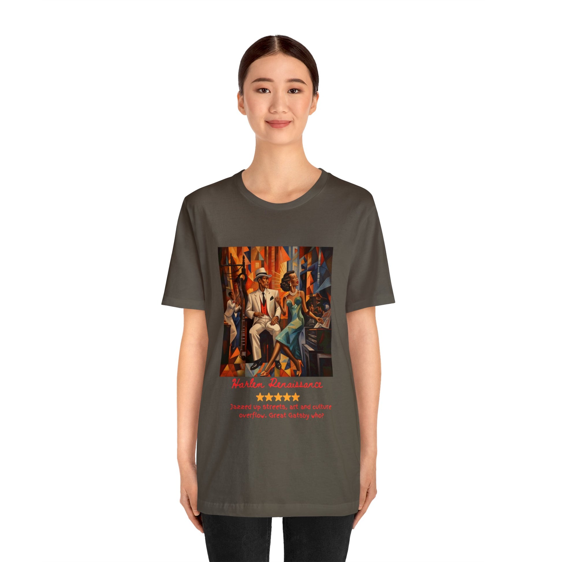 Harlem Renaissance- Yelp review inspired teethe soft cotton is incredibly comfortable, and the print quality is top-notch, ensuring it remains a favorite in my wardrobe. The ribbed knit collars and taping on the shoulders are thoughtful touches that guarantee a great fit over time. I'm impressed by the attention to detail, and the dual side seams are definitely a game-changer in maintaining the tee's shape